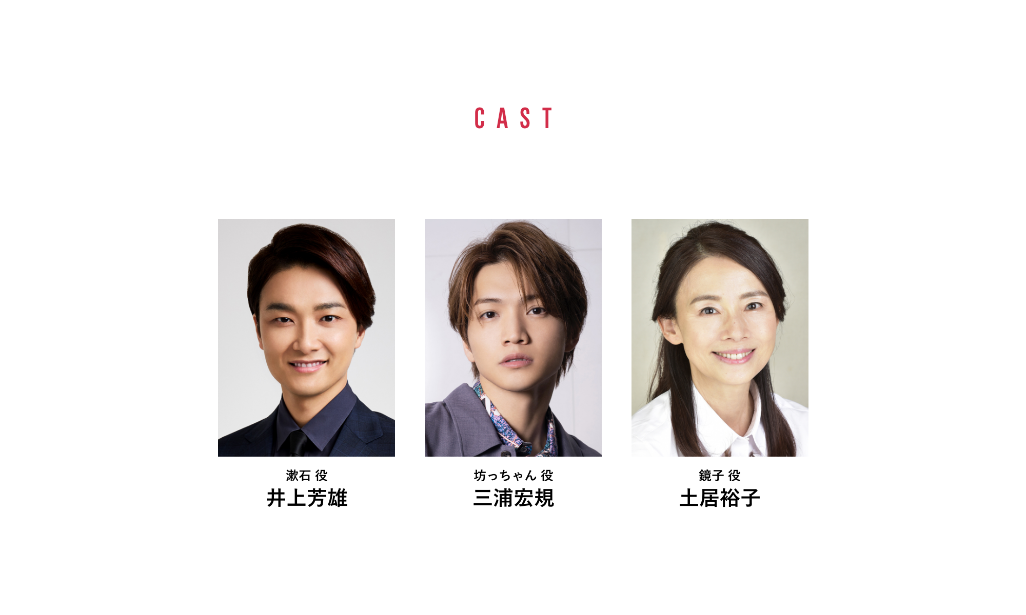 苦悩の底にあった夏目漱石が小説『坊っちゃん』の執筆を通して自己を回復していく姿と、それを受け止める妻・鏡子。史実とフィクションを織り交ぜ、漱石の日常と小説世界がシンクロする巧みなオリジナルストーリーと演出が高い評価を受けた本作。劇作家としても活動し、多彩な作品で観客を魅了しているG2が演出を手掛けます。