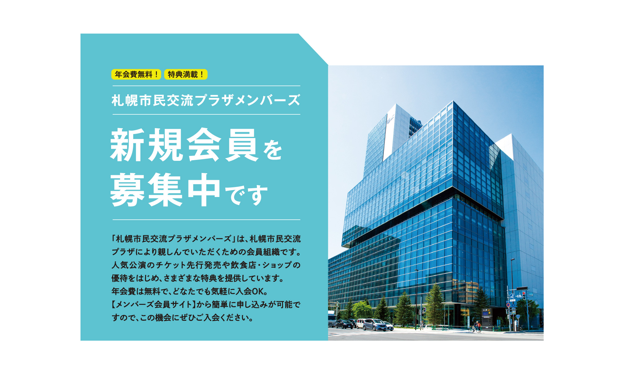 「札幌市民交流プラザメンバーズ」は、札幌市民交流プラザにより親しんでいただくための会員組織です。人気公演のチケット先行発売や飲食店・ショップの優待をはじめ、さまざまな特典を提供しています。