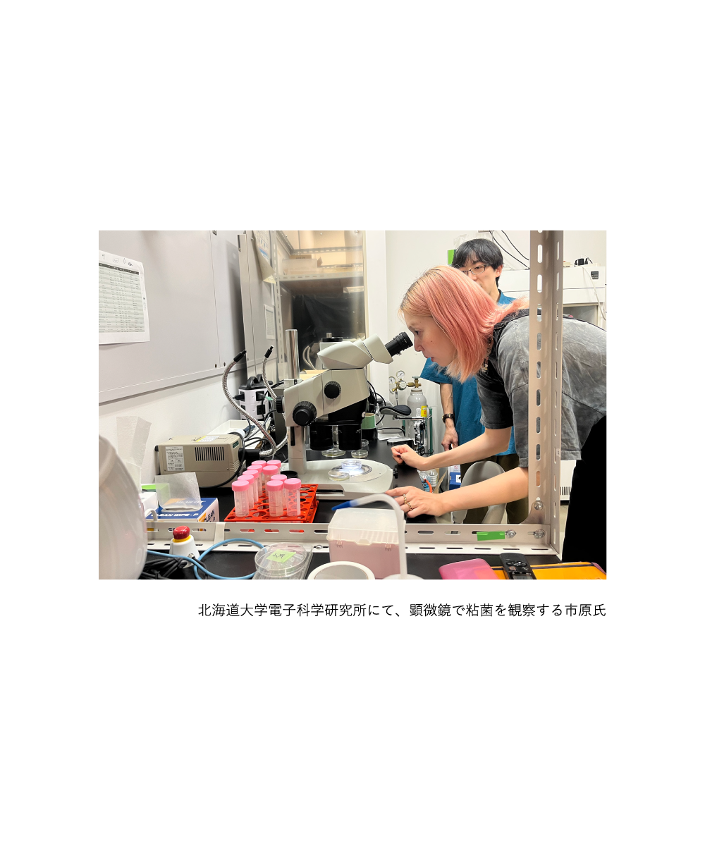 そして、粘菌を研究している中垣俊之先生(北海道大学電子科学研究所教授)の研究所も訪ねました。そこで顕微鏡を通して、単細胞生物や粘菌(モジホコリ)を観察し、その人間とはかけ離れた存在に強い刺激を受けました。こうした人間とはかけ離れた生殖をする生物の存在は、人間の生殖や生き方をまた違う角度から捉え直すことにつながります。ぜひ作品に取り入れてみたいと感じました。