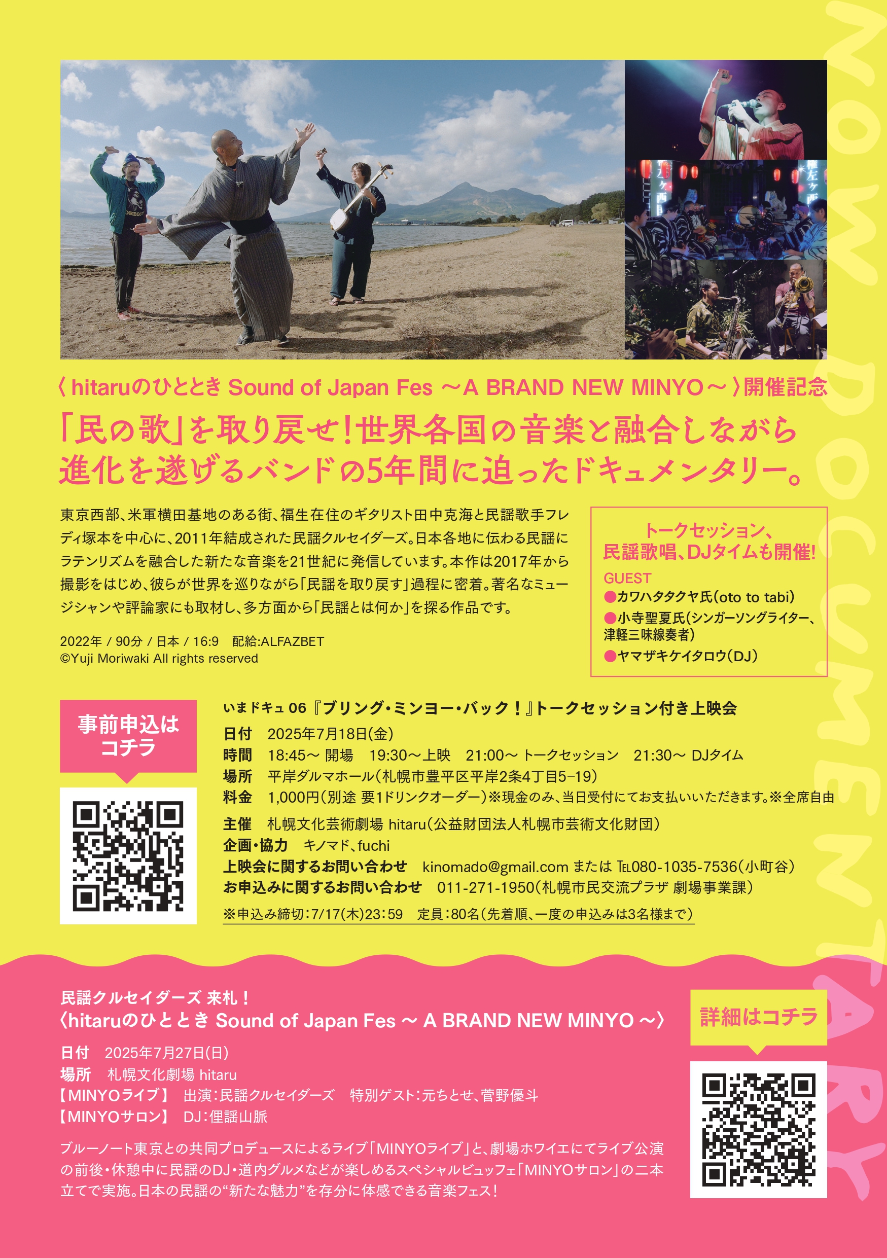 7/27(日)に札幌文化芸術劇場 hitaruにて開催される「hitaruのひととき Sound of Japan Fes ~A BRAND NEW MINYO~」の開催を記念して、本イベントに出演する話題のラテン×民謡バンド・民謡クルセイダーズの音楽ドキュメンタリーの上映会を平岸ダルマホールにて開催します。