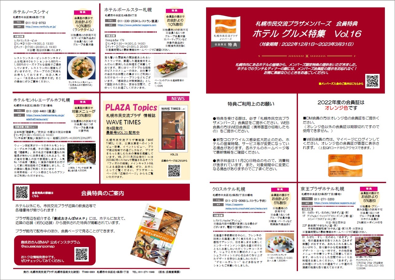 札幌市内にあるホテルの皆様から、メンバーズ限定特典の提供をいただきました。