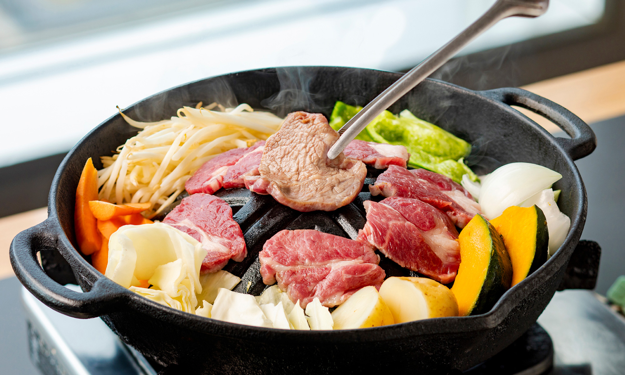 中央が盛り上がった鉄鍋で羊肉をジュウジュウと焼き上げるジンギスカンは、道産子が愛してやまないソウルフードです。