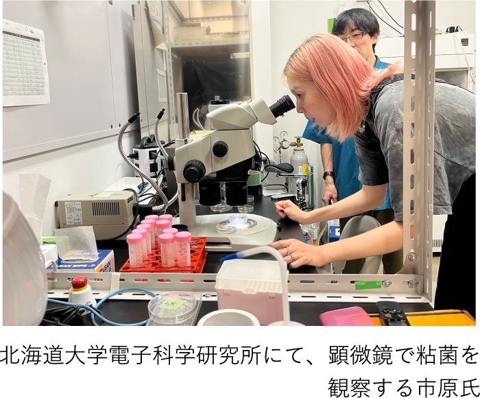 そして、粘菌を研究している中垣俊之先生(北海道大学電子科学研究所教授)の研究所も訪ねました。そこで顕微鏡を通して、単細胞生物や粘菌(モジホコリ)を観察し、その人間とはかけ離れた存在に強い刺激を受けました。こうした人間とはかけ離れた生殖をする生物の存在は、人間の生殖や生き方をまた違う角度から捉え直すことにつながります。ぜひ作品に取り入れてみたいと感じました。